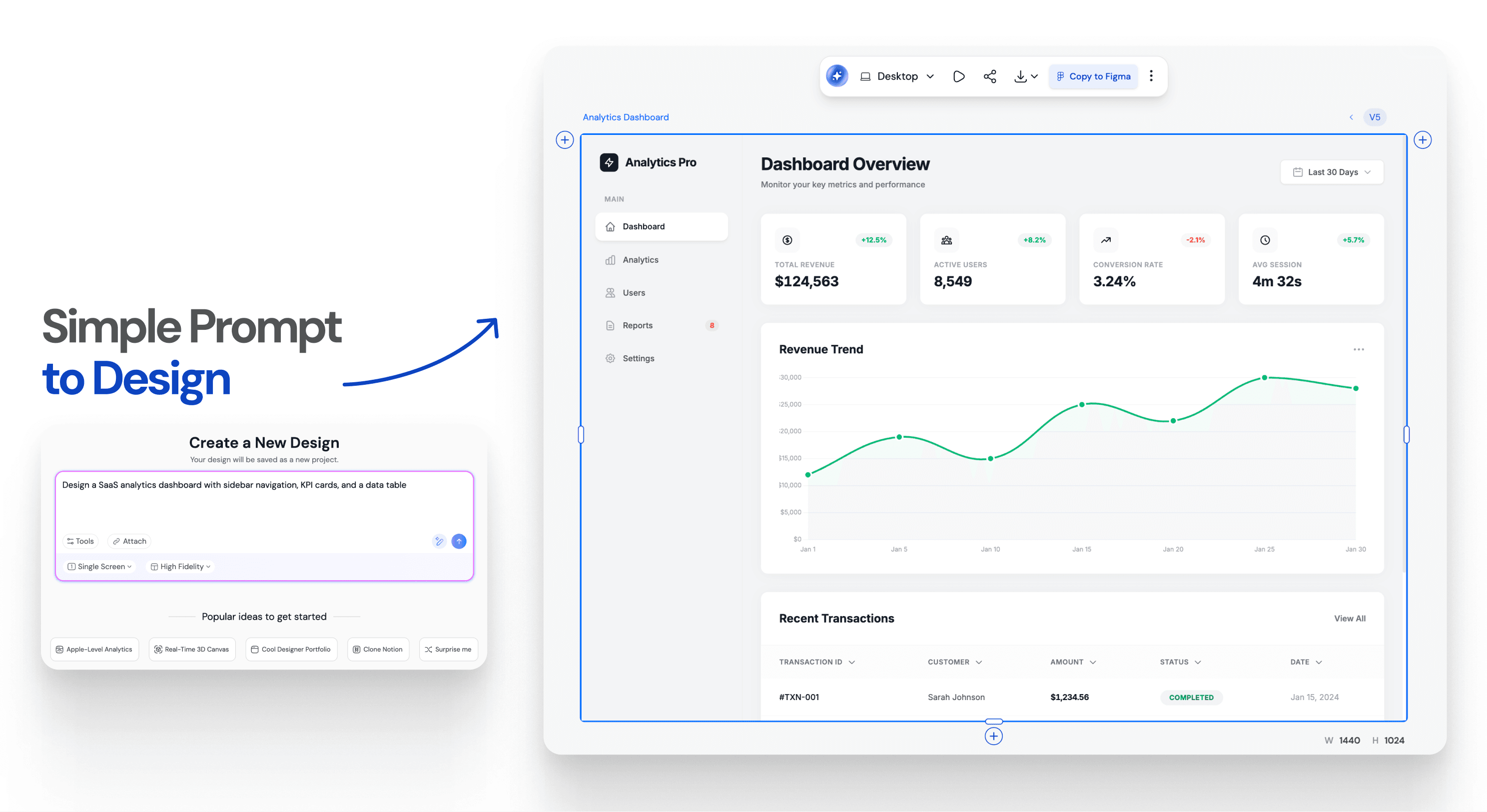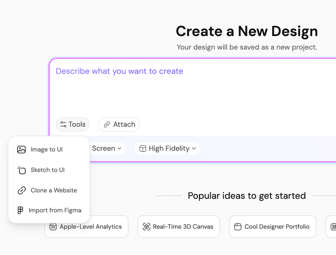 An AI UI Design Generator is a tool that creates user interface designs automatically using artificial intelligence. Instead of starting from a blank canvas, users can generate UI layouts by providing a text prompt, a screenshot, a sketch, or a live website URL.