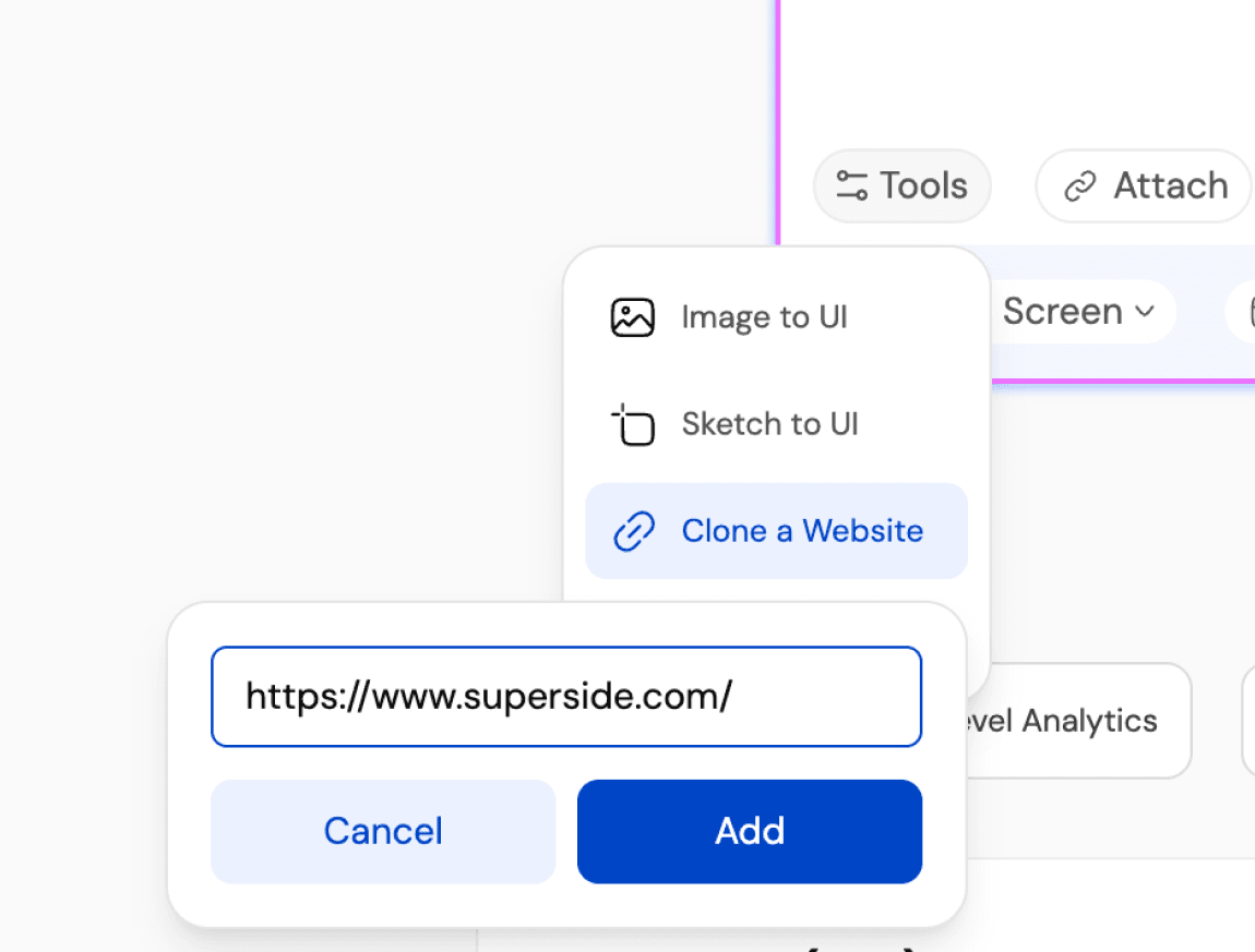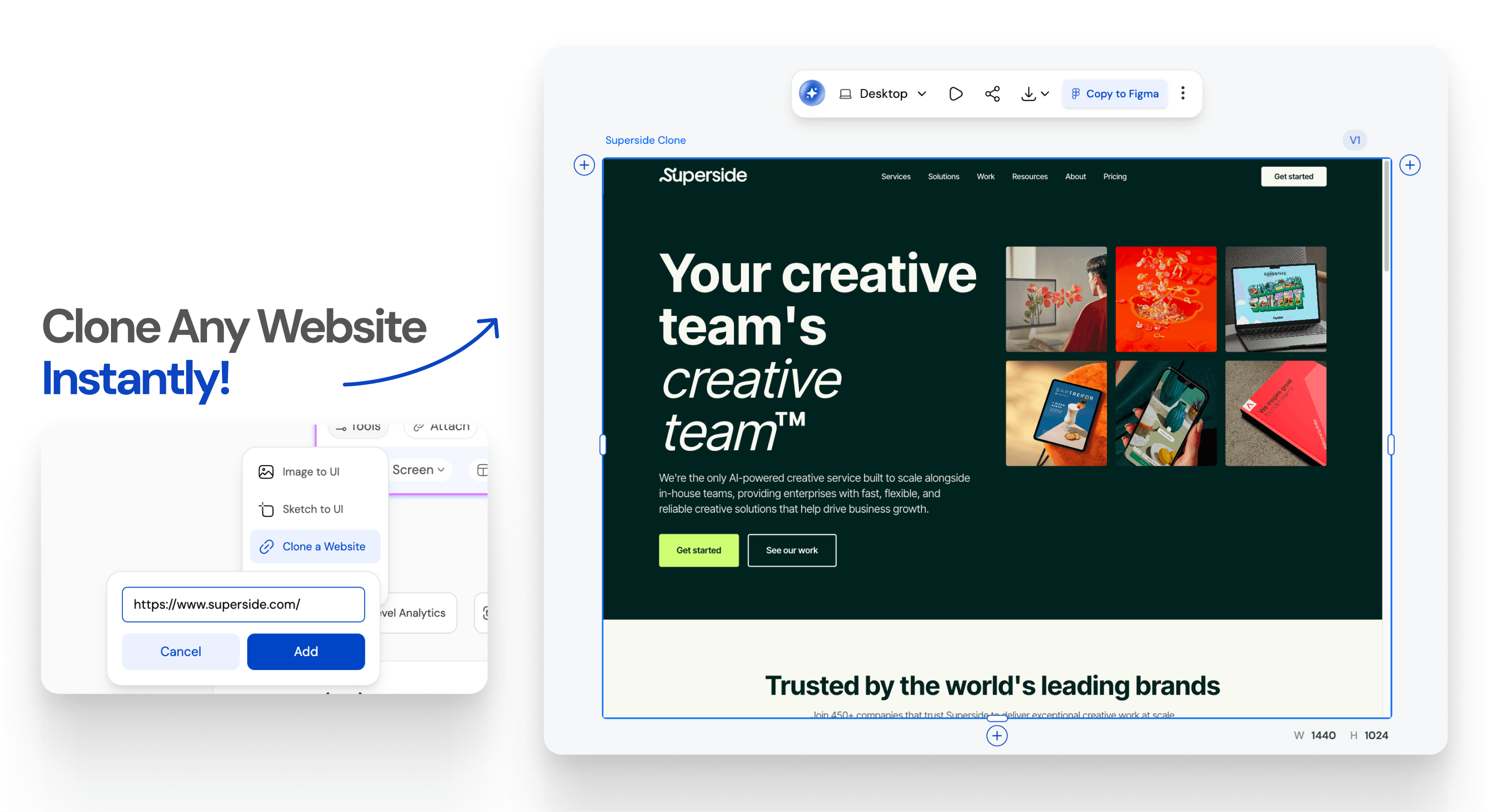 Cloning a website means deeply analyzing the layouts and assets of the existing design and instantly transforming a live URL into an editable design. Instead of manually recreating layouts, colors, typography, and components, a cloning tool analyzes the site’s structure and reproduces it automatically, saving 70% of the time with manual recreation.