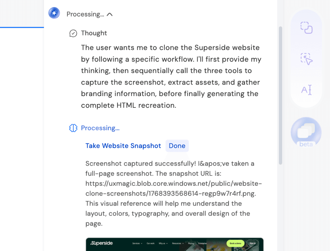 UXMagic’s website cloning feature focuses on design and structure, not backend functionality. It helps you understand industry best practices by seeing exactly how professional sites are structured under the hood. When migrating or updating an old site, cloning gives you a "clean" version of the current state to use as a foundation for the new design you want to create. It recreates layouts, assets, and components with high accuracy so you can redesign, iterate, or develop faster using real-world interfaces as a starting point.