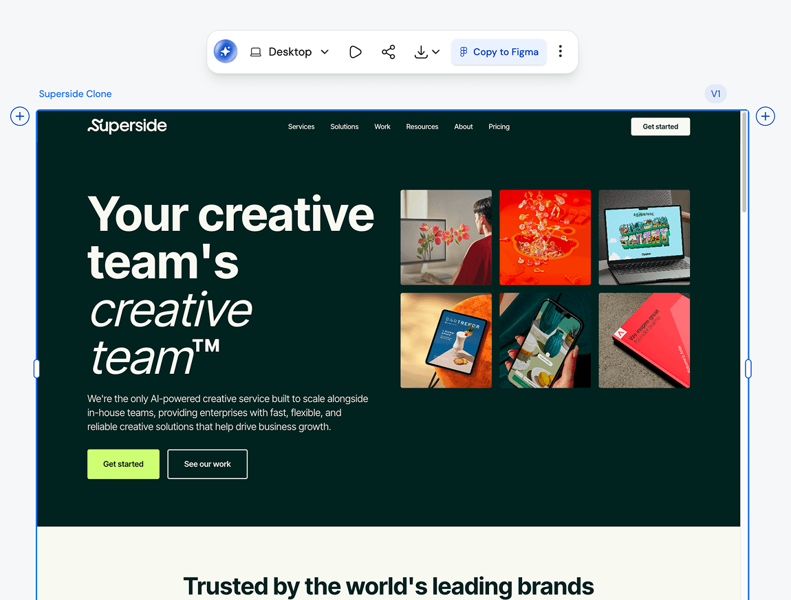 Once cloned, you can export the design to Figma or get production-ready code in React, HTML/CSS.