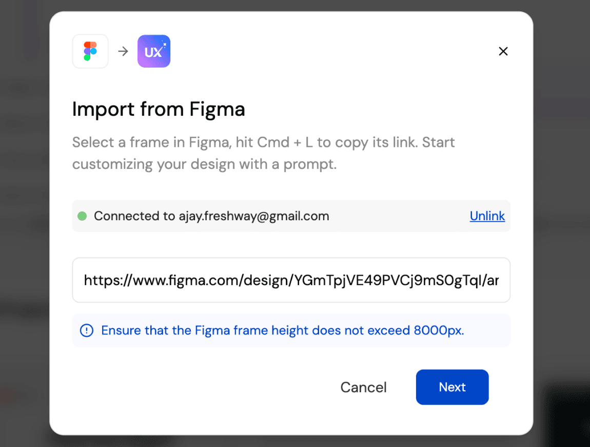 Import from Figma changes that workflow. Instead of treating Figma as the final stop, UXMagic lets teams import Figma designs and continue iterating on them with AI before exporting production-ready code.