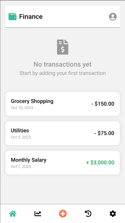 Includes both empty and filled views — Covers more prompt requirements, showing an empty state and transaction list.